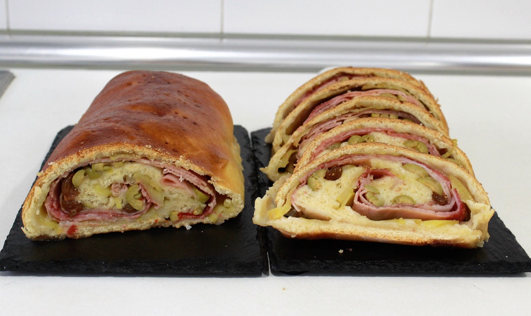 - Las aceitunas rellenas de pimiento cortadas en trozos (100 gr para cada pan) y las pasas (50 gr para cada pan).