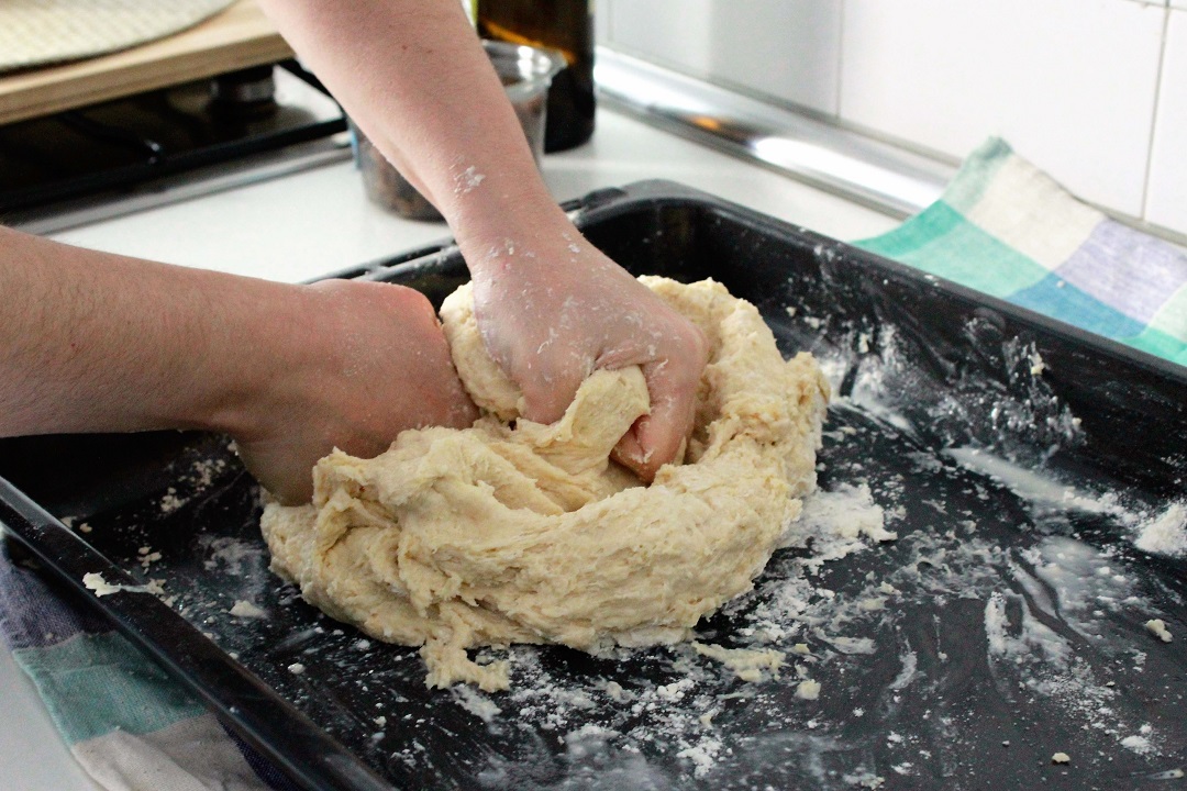 - Si queda muy líquida colocamos un poco más de harina y continuamos amasando. O si queda muy seca, le ponemos un chorrito de agua templada.